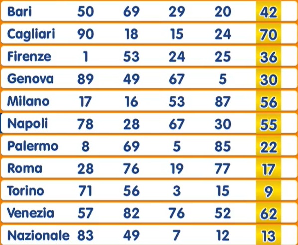 E’ previsto anche il gioco su “Tutte”. In questo caso per vincere è sufficiente che la combinazione giocata esca su una qualsiasi ruota ad eccezione della Nazionale.