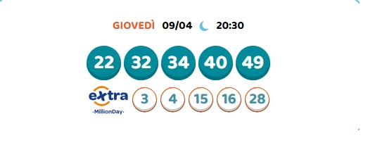 Con il Million Day c’è sempre una nuova opportunità per vincere un milione di euro o 100.000 euro con l’opzione Extra. Le estrazioni Million Day vengono effettuate ogni giorno, dal lunedì alla domenica, alle ore 13:00 e alle 20:30.