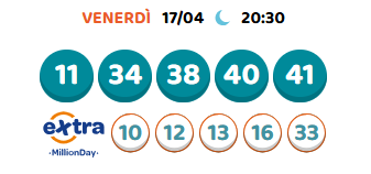 Un nuovo appuntamento con l’estrazione serale del Million Day. Per partecipare al Million Day è necessario compilare una schedina selezionando 5 numeri compresi tra l’1 e il 55 e attendere le estrazioni delle combinazioni numeriche per scoprire se la propria giocata è vincente.