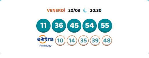 Un nuovo appuntamento con l’estrazione serale del Million Day. Per partecipare al Million Day è necessario compilare una schedina selezionando 5 numeri compresi tra l’1 e il 55 e attendere le estrazioni delle combinazioni numeriche per scoprire se la propria giocata è vincente.