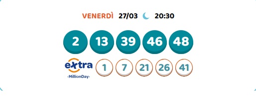 Un nuovo appuntamento con l’estrazione serale del Million Day. Per partecipare al Million Day è necessario compilare una schedina selezionando 5 numeri compresi tra l’1 e il 55 e attendere le estrazioni delle combinazioni numeriche per scoprire se la propria giocata è vincente.