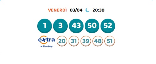 Un nuovo appuntamento con l’estrazione serale del Million Day. Per partecipare al Million Day è necessario compilare una schedina selezionando 5 numeri compresi tra l’1 e il 55 e attendere le estrazioni delle combinazioni numeriche per scoprire se la propria giocata è vincente.